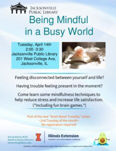 Jacksonville Public Library in collaboration with Karina Moore of The Morgan County University of Illinois Extension presents: “Being Mindful in a Busy World” on April 14.