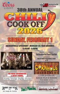 Join us for the 38th Annual Chili Cook-Off hosted by the Jacksonville Speedway! Events are from 11:00 AM- 6:00 PM.…